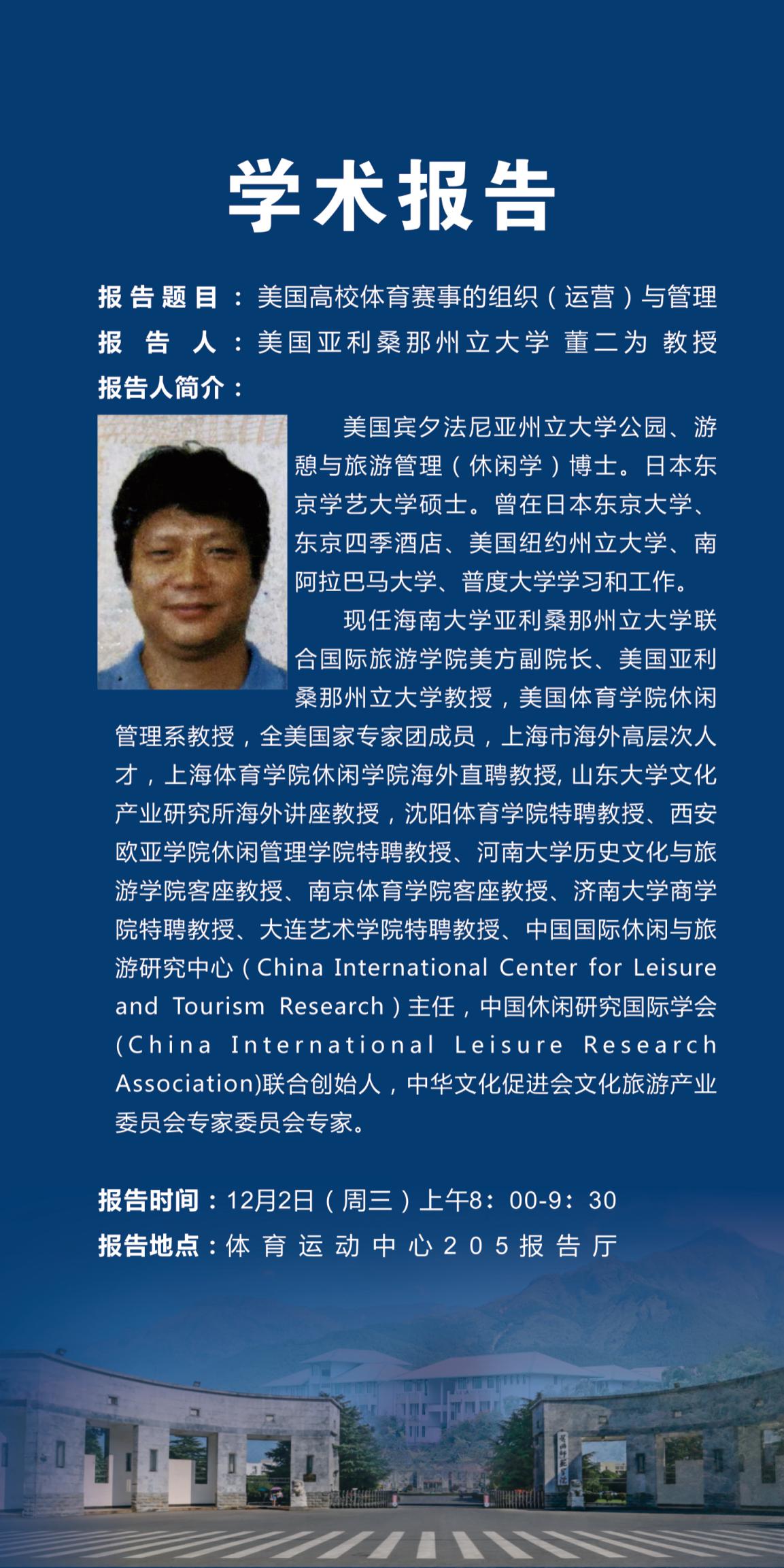 12月2日,公司荣幸地邀请到美国专家董二为教授来院讲学,公司组织了2019级部分员工和相关专业教师共计100余人参加了讲座学习。董二为教授是美国亚利桑那州立大学教授,美国威廉官方网站休闲管理系教授,现任海南大学亚利桑那州立大学联合国际旅游公司美方副经理,是运动休闲领域的国际知名专家。董教授为公司师生作了题为《美国高校体育赛事的组织(运营)与管理》的学术报告,从美国高校体育赛事现状、美国高校运动员输送渠道、美国高校体育赛事的组织(运营)与管理、美国高校体育赛事对文化/社会/经济等方面影响、美国高校体育赛事对中国的启示等五个方面进行了阐述,开拓了公司师生的学术视野,增加了公司师生的学术修养。