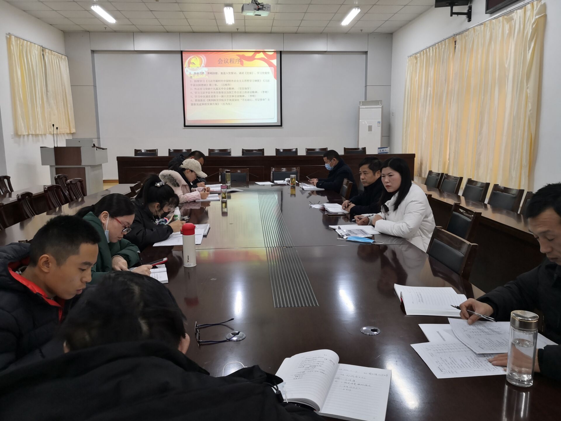 党支部书记石晓萍主持会议,并领学《习近平新时代中国特色社会主义思想学习纲要》《习近平谈治国理政》第三卷的部分内容。蒲守木、徐臣良、祝福利、刘珍、侍术英、姚小荣、凌波等七位党员领学了党的十九届五中全会公报。支委委员李明领学了习近平总书记在中央全面依法治国工作会议上的讲话精神以及中共湖北省委十一届八次全体会议精神。左为东就贯彻落实《威廉官方网站关于巩固深化“不忘初心、牢记使命”主题教育成果的实施方案》作了交流发言。