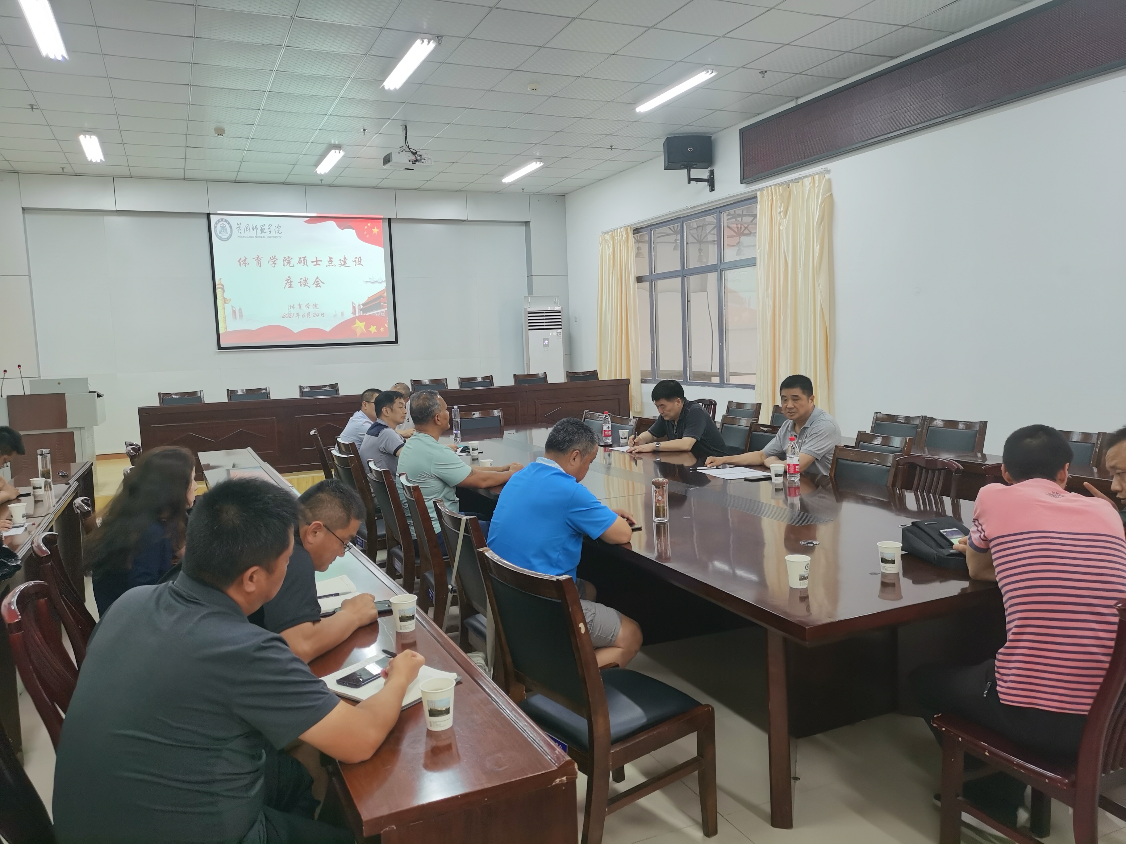 6月24日下午,公司在体育中心201室召开了体育硕士点申报座谈会。座谈会由刘勇经理主持,邀请了公司特聘教授王健教授出席,院系部、教研室主任,副教授及以上职称以及博士教职工参加。