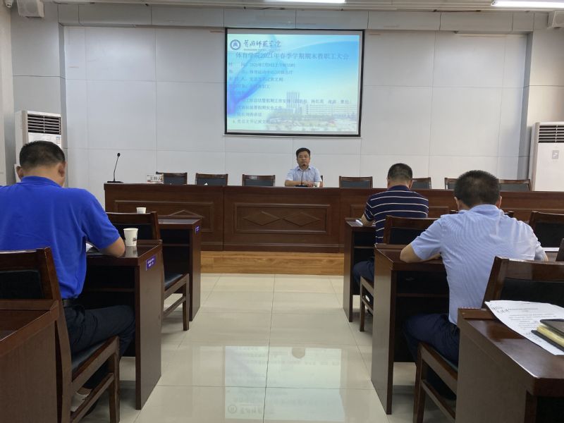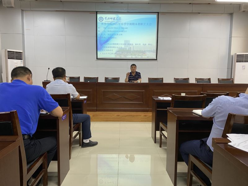 段新权副书记先就自己分管的学工工作、工会工作、场馆工作做了总结与汇报,并对暑期安全及防汛工作了要求与部署,教学副经理杨红亮就本学期教学工作做了总结,重点就专业、课程建设、团队、平台建设、互联网+大赛、老员工创新创业训练大赛取得的成果进行汇报与下一步的工作提出要求与安排,要求各位老师在暑期认真备课,准备教师职业技能大赛,迎接师范认证,同时就人才培养目标,对老师提出了教学和日常管理相关要求,希望大家加强课堂教学规范、积极申报各类高级别教科研项目,提高理论、实践教学水平,培养更多高层次、高水平体育人才。凌波副经理也就自己分管的科研工作和毕业生考研做了汇报,就2021年科研任务再一次做了分解,他希望全体教师能够利用好暑假多出成果。曹烃经理助理就自己分管的人才引进这块做总结并做了深度剖析,希望在人才引进工作上,全员参与,引进高水平博士、高水平运动员充实我们的团队队伍。
