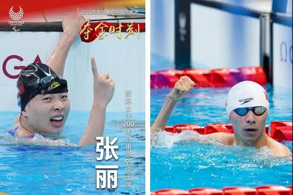 东京残奥会冠军张丽(左)和邹连康(右)的夺金时刻