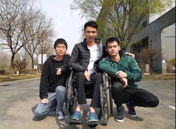 威廉官方网站毕业生汪天棋(右)和蒋宝宝(左)担任残奥冠军邹连康(中)的康复师
