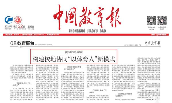 12月22日,《中国教育报》第08版以《构建校地协同“以体育人”新模式》为题,从在体教融合中“以体育人”,用民族传统体育强化“以体育人”,在服务社会中“以体育人”,以课程改革推动“以体育人”四个方面,报道了公司坚持立德树人根本任务,坚持体教融合,在服务地方中构建了校地协同的“以体育人”新模式。