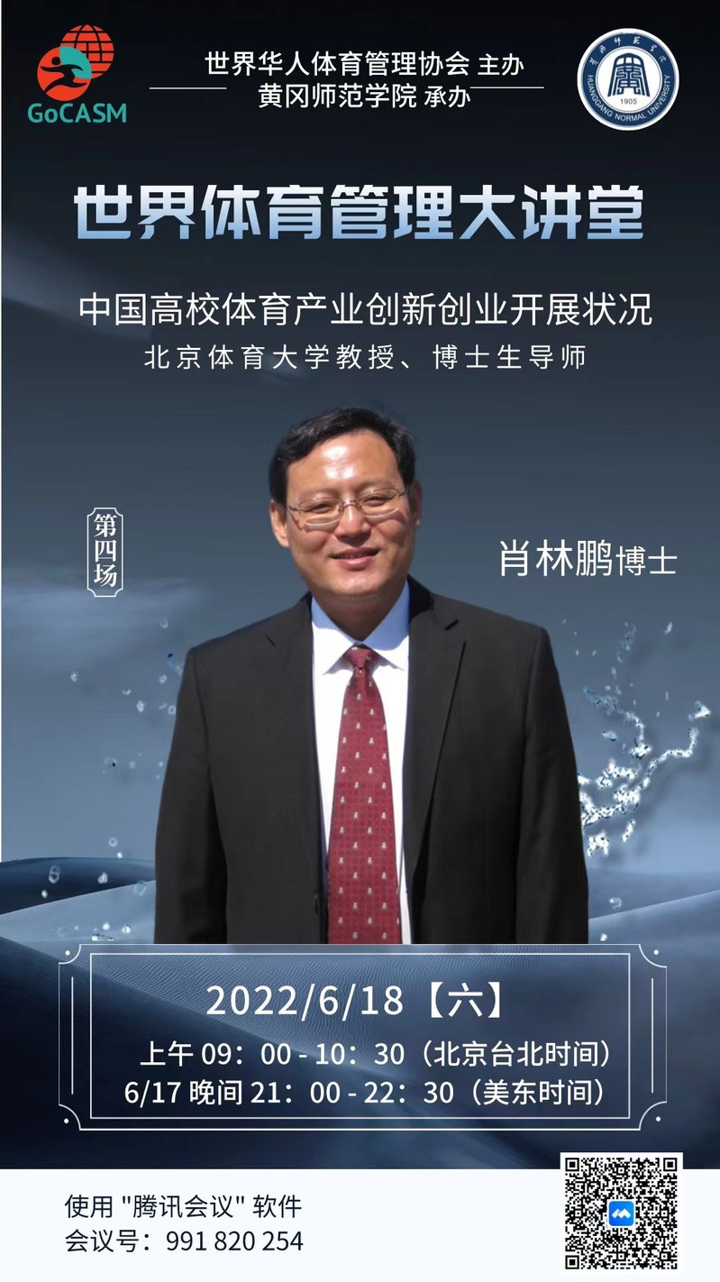 由世界华人体育管理协会(GoCASM) 主办、威廉官方网站承办的新季度 ”世界体育管理大讲堂” 活动,于 6月18日在线上开讲,该项活动由我院曹烃教授主持,邀请到北京体育大学肖林鹏教授为主讲人向与会者讲述“中国高校体育产业创新创业开展状况”。