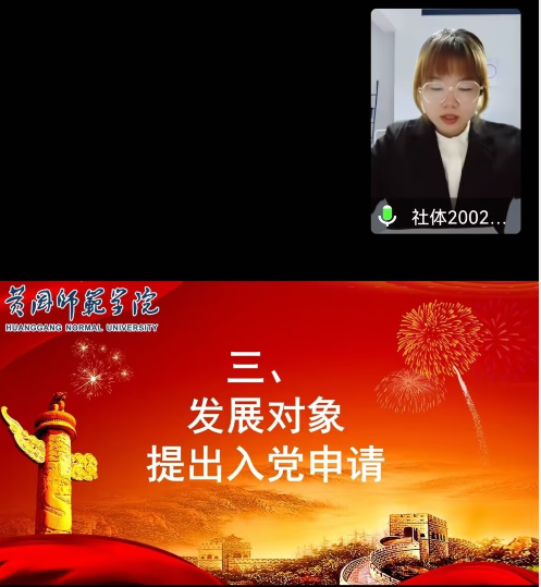 3、发展对象胡彬彬提出入党申请,并汇报培养考察期内的学习、工作、生活动态,及向党组织说明的相关问题。