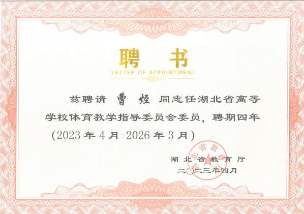 据悉,省教指委是省教育厅领导下,对全省高等公司体育公司产品、学科发展、竞赛训练等开展研究、咨询、指导、评估、服务等工作的专家组织,是非常设学术机构。曹烃教授此次当选,既是对其政治素养和工作业务能力的充分肯定,同时对增进公司与省内兄弟院校的交流,推动公司体育教学、体育专业建设和体育学科高质量发展具有积极的意义。