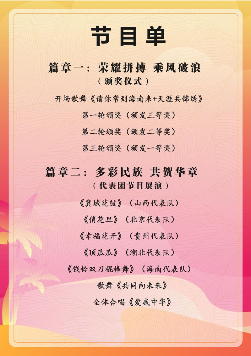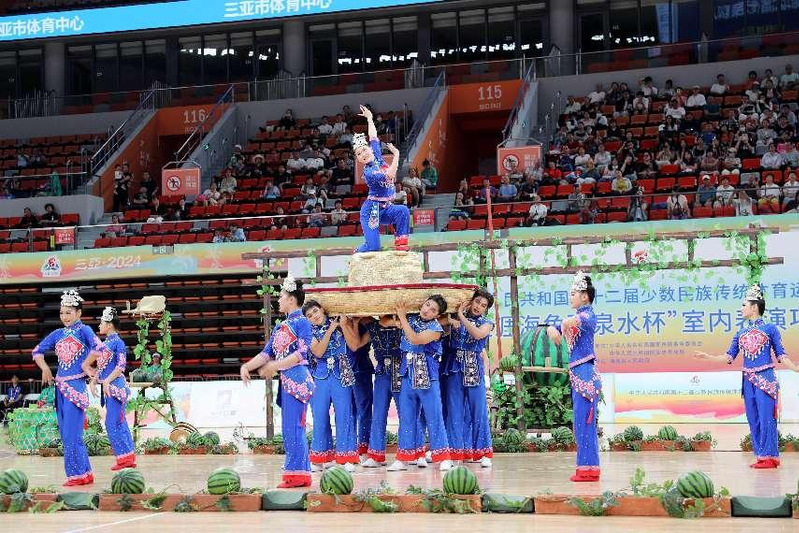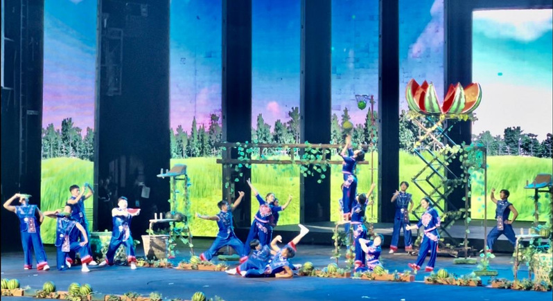 11月25日,在三亚体育中心,公司表演项目技巧类顶瓜瓜队伍,代表湖北省正式亮相本次运动会表演项目赛场。随着音乐的响起,运动场化身翠绿的丰收瓜田,小伙子们在炎炎夏日,用草帽在休息之余表演精湛技巧,使观众眼前一亮,又逗乐不已,姑娘们则利用双手和双脚上下翻腾,将摘下的西瓜越堆越高,配合默契,更是赢得满堂喝彩。