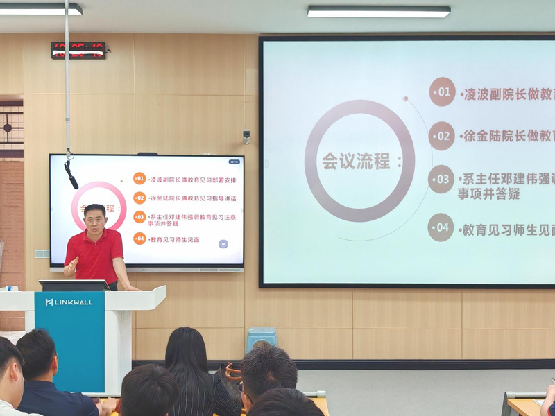 随后,系主任邓建伟从教育见习课程性质、重要性、具体管理分工等方面做详细讲解与布置,并重点强调往返交通安全和纪律要求,要求同学们以良好的精神风貌和准教师职业形象完成好见习各项任务