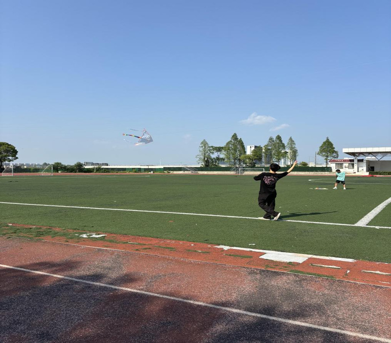 体育运动区则多是男生在操场奔跑着,嬉戏着,他们一边谈笑,一边放着风筝。郭褀睿拿着一个大风筝,像个孩子似的,欢乐地在操场奔跑,奔跑......风筝在他的手中先是忽上忽下,后来慢慢地飞上了天空,越来越稳,越飞越高,同学们都跟着他一起欢呼起来......